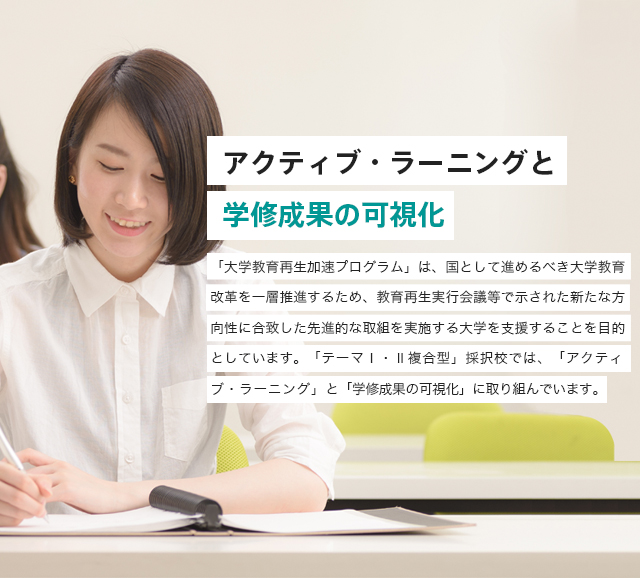 「大学教育再生加速プログラム」は、国として進めるべき大学教育改革を一層推進するため、教育再生実行会議等で示された新たな方向性に合致した先進的な取組を実施する大学を支援することを目的としています。「テーマⅠ・Ⅱ複合型」選定校では、「アクティブ・ラーニング」と「学修成果の可視化」に取り組んでいます。